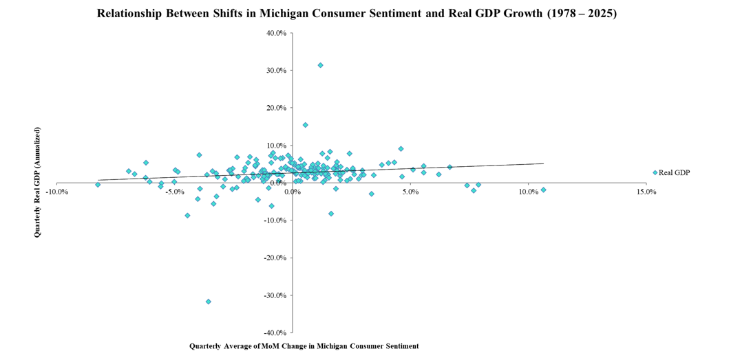 While the trendline showed a mild positive slope, the relationship was statistically weak and economically insignificant, with just under 2% of the variation in real GDP being explained by changes in consumer sentiment. Some of the largest GDP gains, including the 2020 recovery, occurred when sentiment remained subdued. These disconnects emphasize the limited value of sentiment data as a forward-looking economic signal.